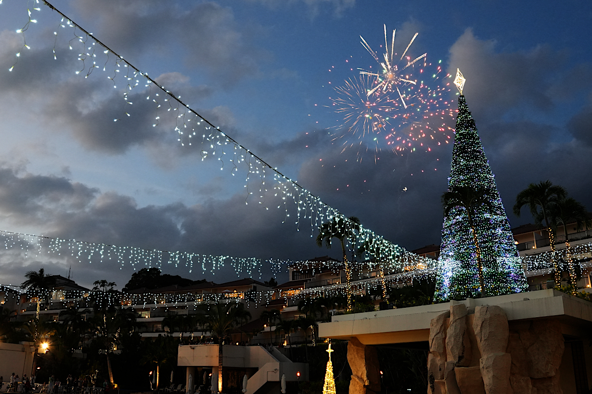 カヌチャの夜空に打ち揚げられる大輪の花火が、イルミネーションの光と一緒に、冬の夜を明るく照らします。