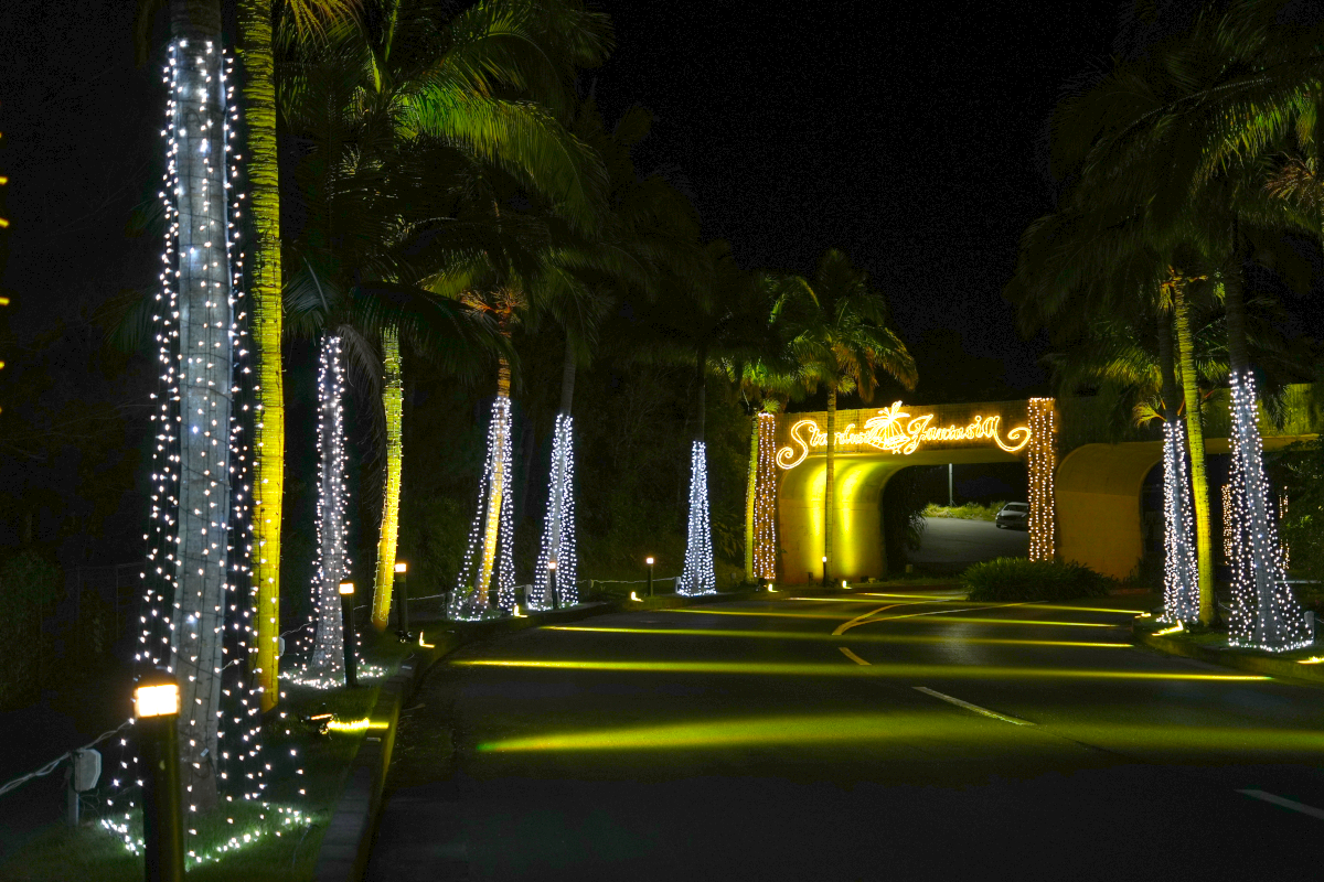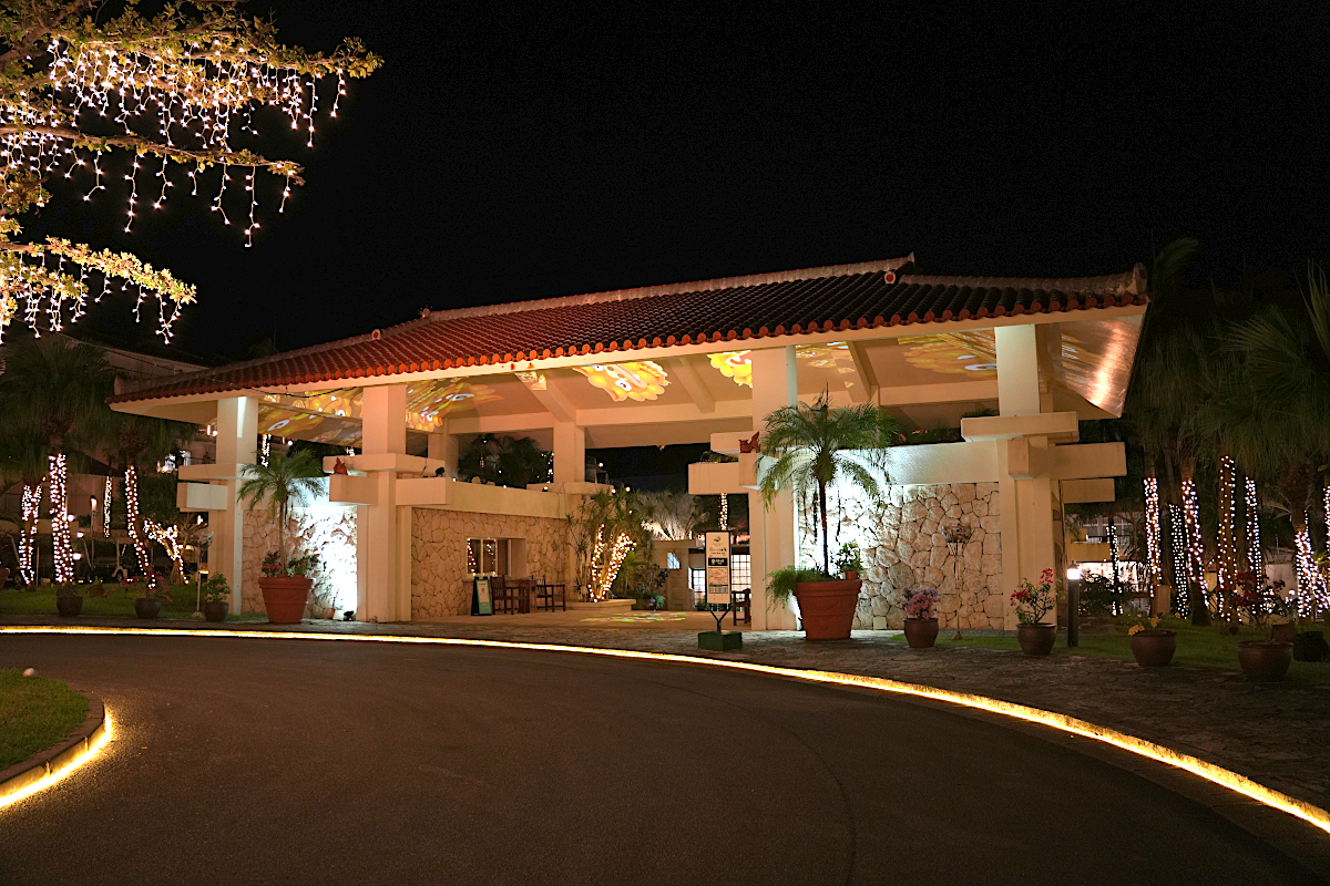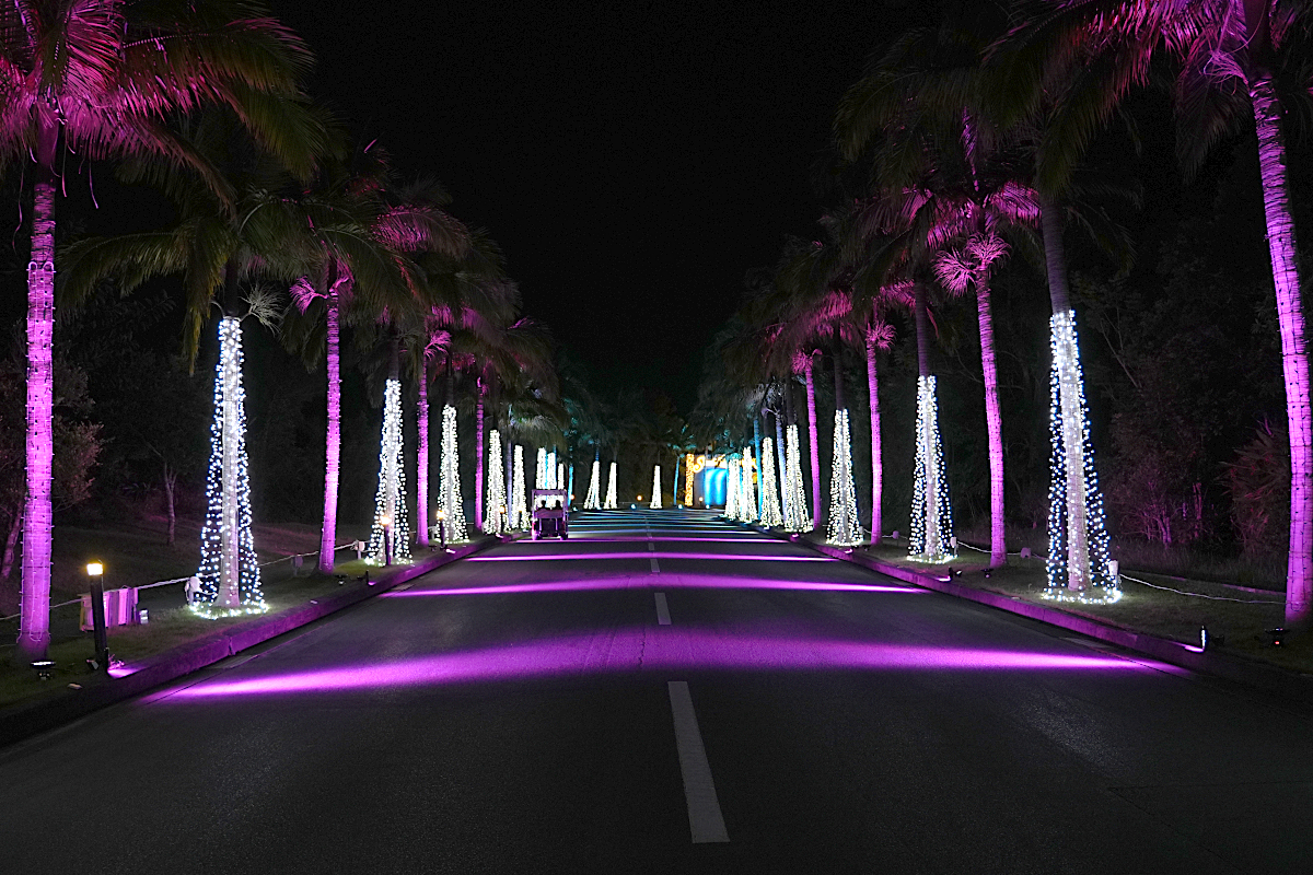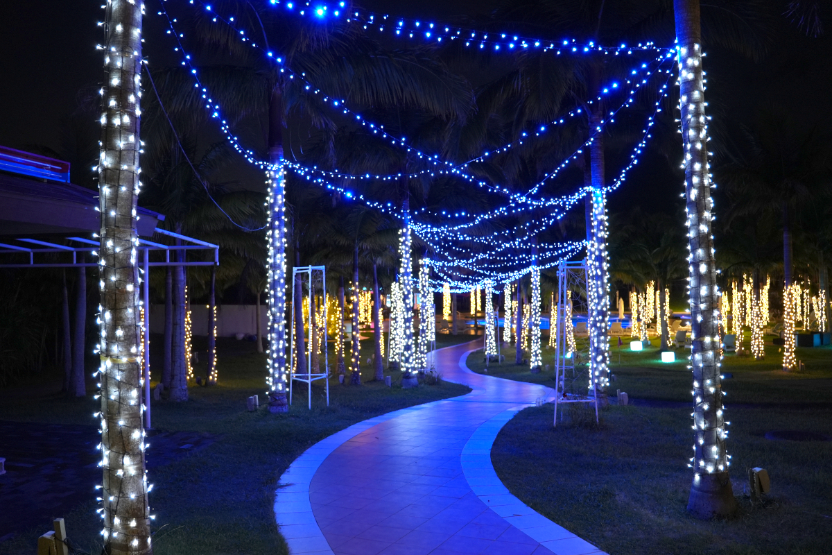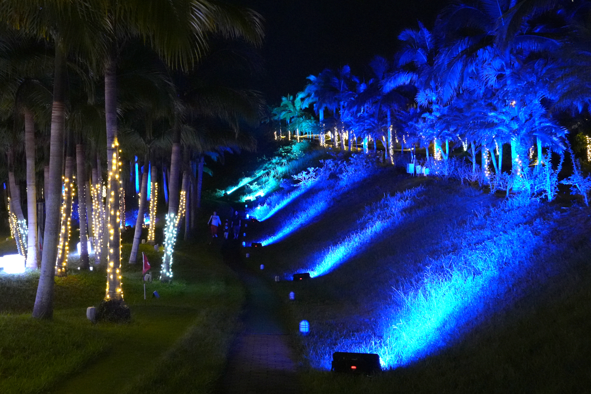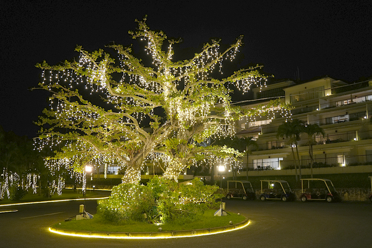 カヌチャリゾートの入口ゲートを抜けて少し進むと、道の両側に立ち並ぶ光輝くヤシの木たちが訪れる皆さまを歓迎します。ホテルフロントでは、カラフルなライトアップをお楽しみいただけます。