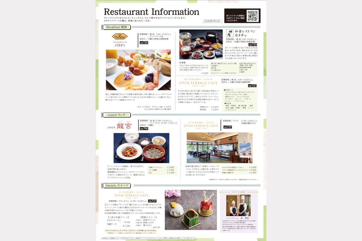 資料・パンフレット カヌチャリゾートをご紹介する資料やパンフレットをご用意しております。ご自由にダウンロードしてご覧ください。※資料・パンフレットはすべてデジタルデータで作成しております。印刷物はございませんのでなにとぞご了承ください。 オプション [デジタルブック] オプショナルガイド「FunFun Club」 環境に対する取り組みや地域社会への貢献、各シーズンにおすすめのアクティビティやイベント情報など、カヌチャリゾートの魅力を知ることができるガイドブックです。 デジタルブックをみる 2026年度オプショナルメニュー一覧≪2026/4/1~2027/3/31≫ アクティビティやリラクゼーションなど、当リゾートでお楽しみいただけるメニューの一覧(2026年度版)です。 ダウンロード 2025年度オプショナルメニュー一覧≪2025/4/1~2026/3/31≫ アクティビティやリラクゼーションなど、当リゾートでお楽しみいただけるメニューの一覧(2025年度版)です。 ダウンロード その他の資料 [デジタルブック] Experience Guide~体験ガイド~ 当リゾートをあますところなくご満喫いただけるよう、やんばる地域とのかかわりや豊富なアクティビティをはじめ、客室やレストランなどの情報を掲載した総合ガイドブックです。会議やパーティをご要望の場合の施設情報も網羅しております。 デジタルブックをみる [デジタルブック] 教育旅行ガイド やんばるのおひざ元という恵まれた立地や自然を活かした修学プログラム、安全・安心に配慮した客室やお食事など、修学旅行その他の教育旅行に関する情報を掲載したガイドブックです。 デジタルブックをみる ゴルフコースリーフレット カヌチャゴルフコースのご案内です。 ※PDFは、リーフレットの一部抜粋です。 ダウンロード レストランインフォメーション 洋食ブッフェから、和食、中華、沖縄料理など、バラエティ豊かな当リゾートの食についてまとめたフライヤー。スタッフおすすめのメニューを見たい方はぜひ一読を。 ダウンロード カヌチャリゾート敷地内マップ 敷地内マップ よくあるご質問