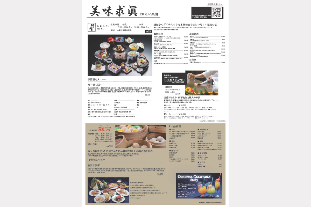 資料・パンフレット カヌチャリゾートをご紹介する資料やパンフレットをご用意しております。ご自由にダウンロードしてご覧ください。※資料・パンフレットはすべてデジタルデータで作成しております。印刷物はございませんのでなにとぞご了承ください。 【2025年度】オプショナルメニュー [デジタルブック] オプショナルガイド「FunFun Club」≪2025/4/1~≫ カヌチャリゾートの取り組みや、各シーズンにおすすめのアクティビティ情報など、「今のカヌチャ」の魅力を知ることができるガイドブックです。 デジタルブックをみる 2025年度オプショナルメニュー一覧≪2025/4/1~2026/3/31≫ アクティビティやリラクゼーションなど、当リゾートでお楽しみいただけるメニューの一覧です。 ダウンロード その他の資料 [デジタルブック] Experience Guide~体験ガイド~ 当リゾートをあますところなくご満喫いただけるよう、やんばる地域とのかかわりや豊富なアクティビティをはじめ、客室やレストランなどの情報を掲載した総合ガイドブックです。会議やパーティをご要望の場合の施設情報も網羅しております。 デジタルブックをみる [デジタルブック] 教育旅行ガイド やんばるのおひざ元という恵まれた立地や自然を活かした修学プログラム、安全・安心に配慮した客室やお食事など、修学旅行その他の教育旅行に関する情報を掲載したガイドブックです。 デジタルブックをみる ゴルフコースリーフレット カヌチャゴルフコースのご案内です。 ※PDFは、リーフレットの一部抜粋です。 ダウンロード レストランガイド「美味求眞」 洋食ブッフェから、和食、中華、沖縄料理など、バラエティ豊かな当リゾートの食についてまとめたフライヤー「美味求眞」。スタッフおすすめのメニューを見たい方はぜひ一読を。 ダウンロード カヌチャリゾート敷地内マップ 敷地内マップ よくあるご質問